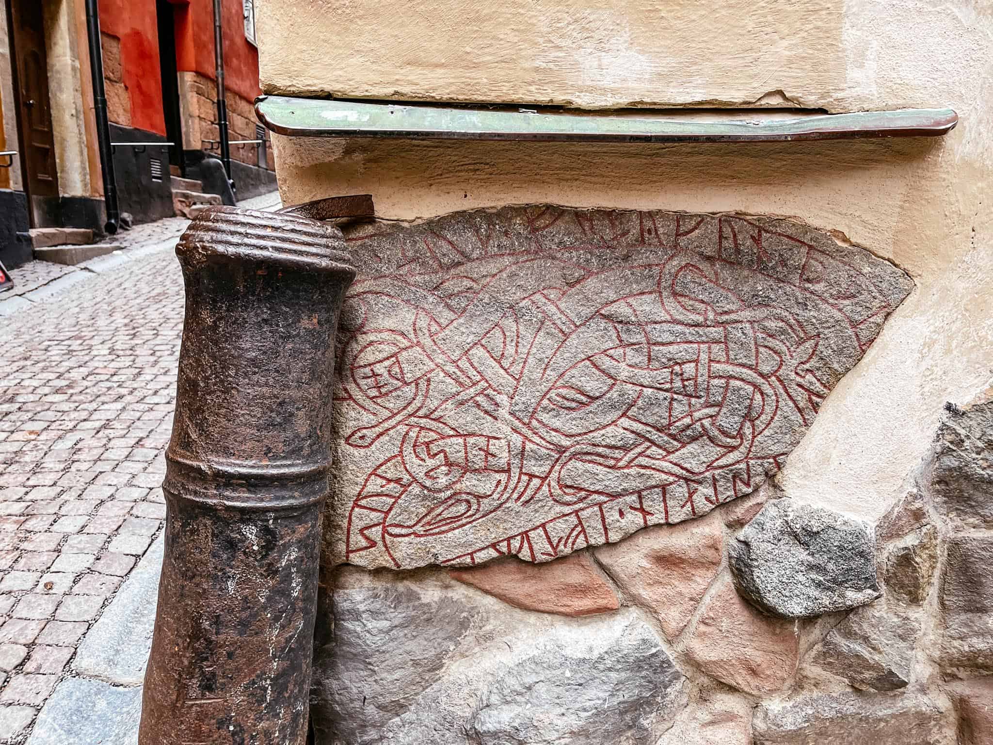 Here we will see a runestone built into the wall of a shop. The stone dates from the Iron Age but historians don’t know exactly how old it is or why it is in a wall in Stockholm. Runestones were usually made to memorialise the dead, and this one says “Torsten and Frogunn had this stone erected after their son”