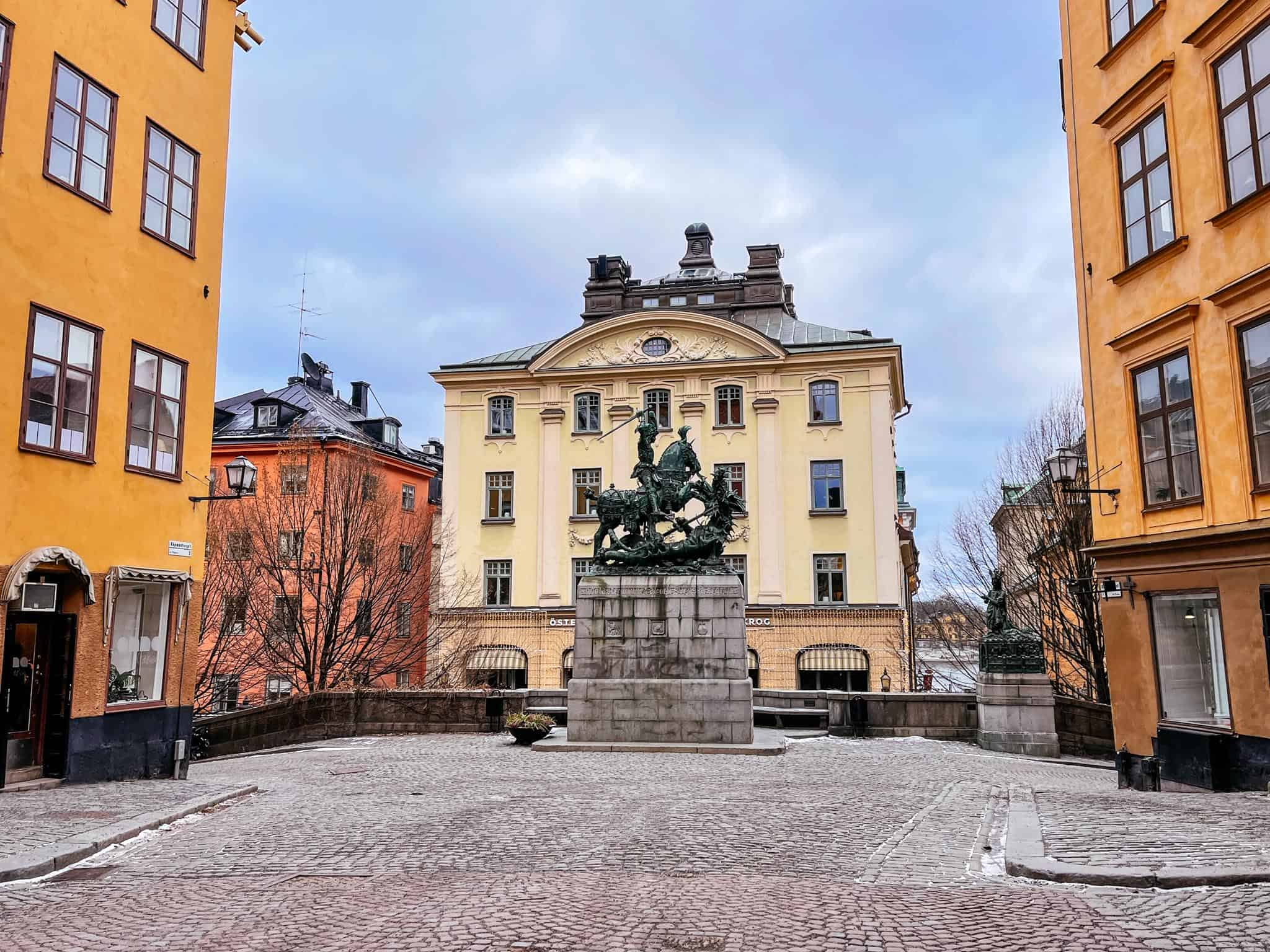 This statue depicts Saint George slaying a dragon. The legend of Saint George dates to the crusades. Saint George is said to have saved an entire village in Libya from a dragon. Provided they converted to Christianity first, of course. The statue is a replica – the original wooden version is in Storkyrkan church.