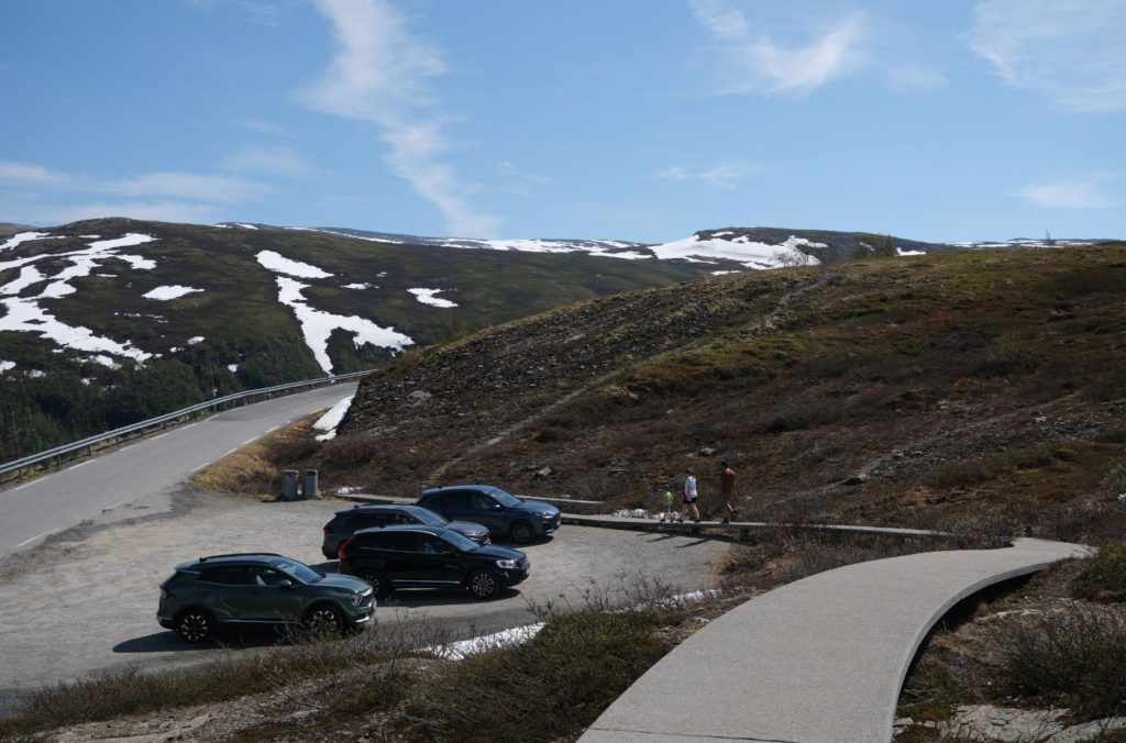 This is a scenic overlook of the mountains. From here, you can see the Jotunheimen massif – on a clear day! A walkway and an ‘infinity’ bench curve away from the road.