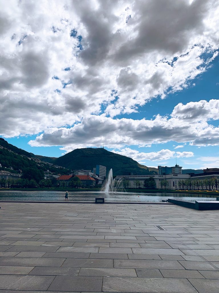 Between the lake and Mt. Ulriken is the train station, the library, and the bus terminal with a large shopping centre on top (Storsenter). To the left of the lake, you’ll see a row of colourful houses. Many of Bergen’s newest and coolest cafes are opening up in these houses. Behind them are 18th-century wooden houses in the area ‘Marken’ – this is also where the Leprosy Hospital is.