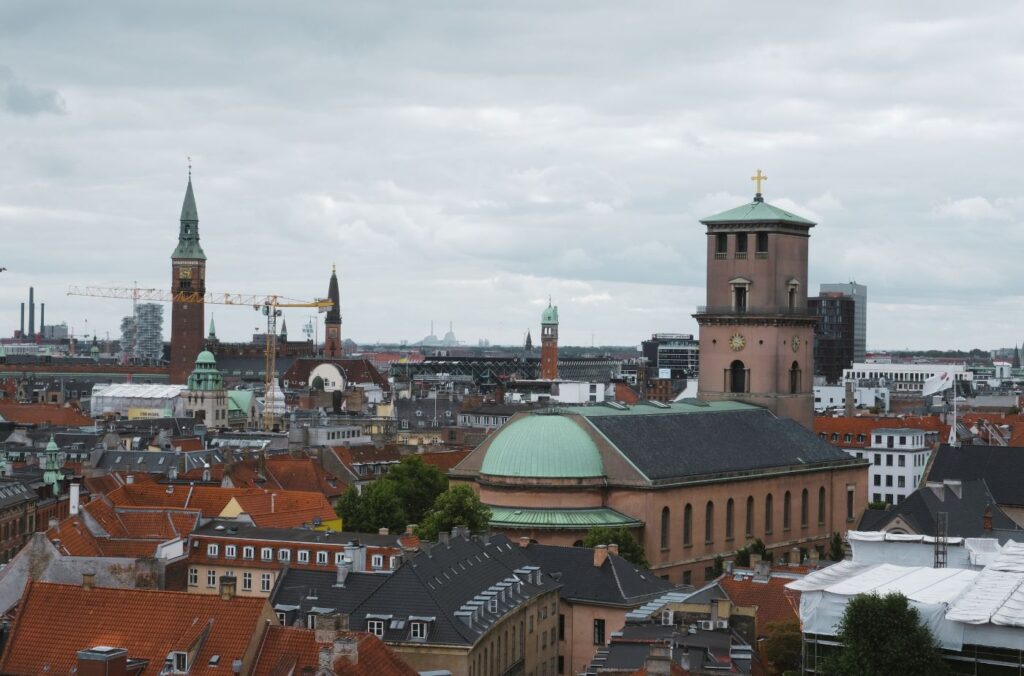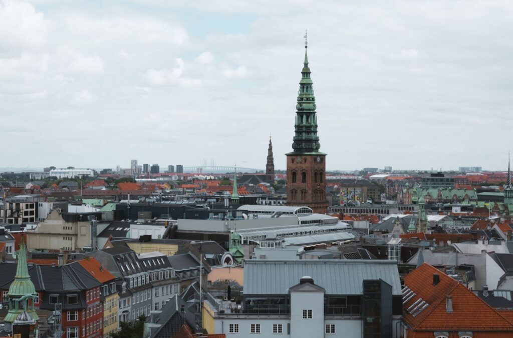 At the summit, the open-air deck provides one of the best panoramic views in Copenhagen, stretching from the old town spires to the Øresund coast. From here, you can see the towers of Copenhagen Cathedral, St. Nicolas Church, Rosenborg Palace, and the Marble Church, and, on clear days, Sweden.