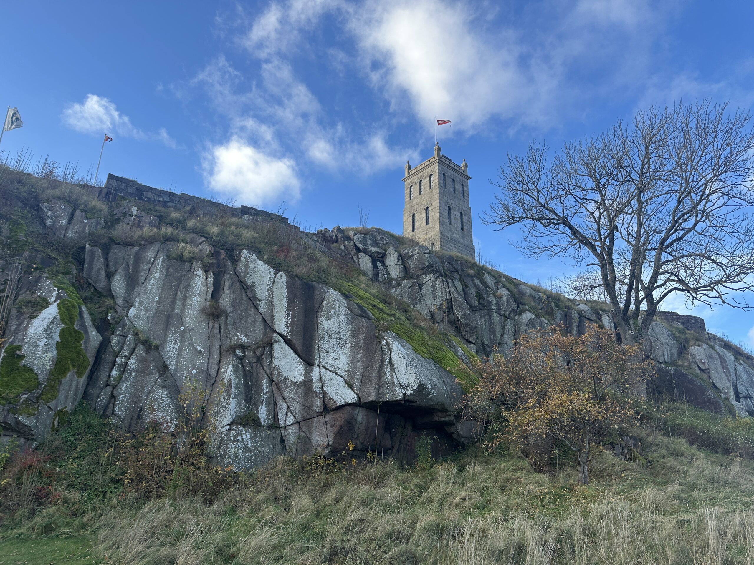 Slottsfjellet (Castle Hill) towers over Tønsberg. There was likely some kind of fortress here before the 12th century during the period of the Norwegian civil war. The fortress underwent massive redevelopment under King Håkon Håkonsson during the 13th century. It burned down in 1503 and was not rebuilt. Today only low ruins remain.