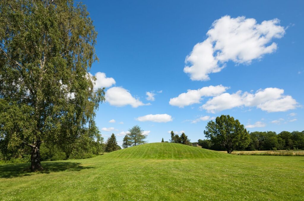 The Oseberg Mound is where the 9th century Oseberg ship was excavated. The ship is now in the Viking Ship Museum in Oslo. In addition to the ship, the mound contained a carriage, five intricately carved bed-posts shaped like animal heads, sledges, beds, chests, weaving frames, utensils and more.