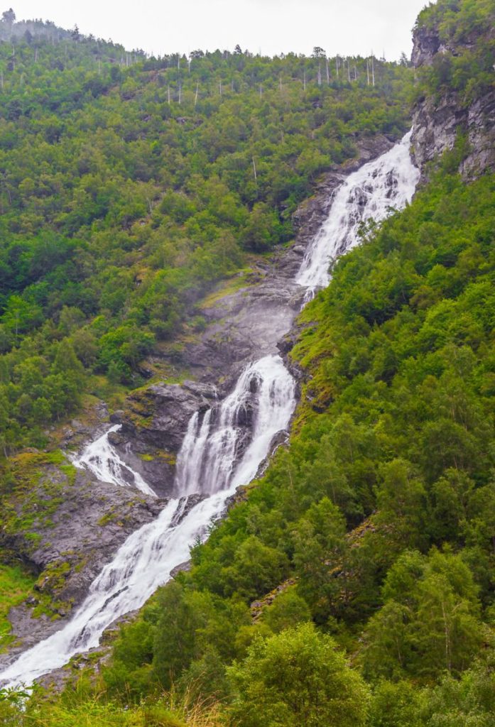 We are now driving along the Sognefjord, which is the longest and deepest fjord in Norway. It is 205km (approx. 125 mi) long and 1303m deep at its deepest point. The width varies from 1 to 2km up to 4 to 5km. Many of the mountains around the fjord are around 1,000 metres high.