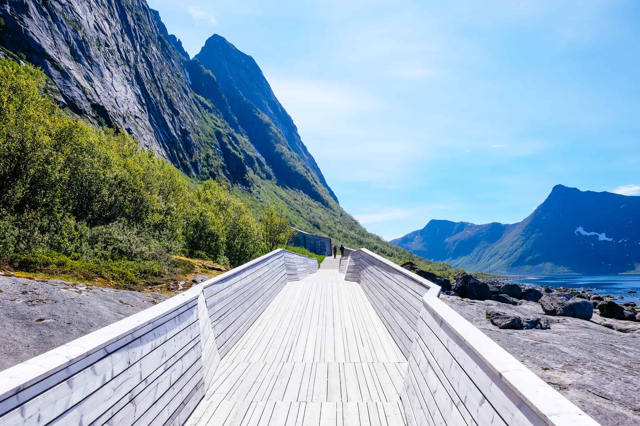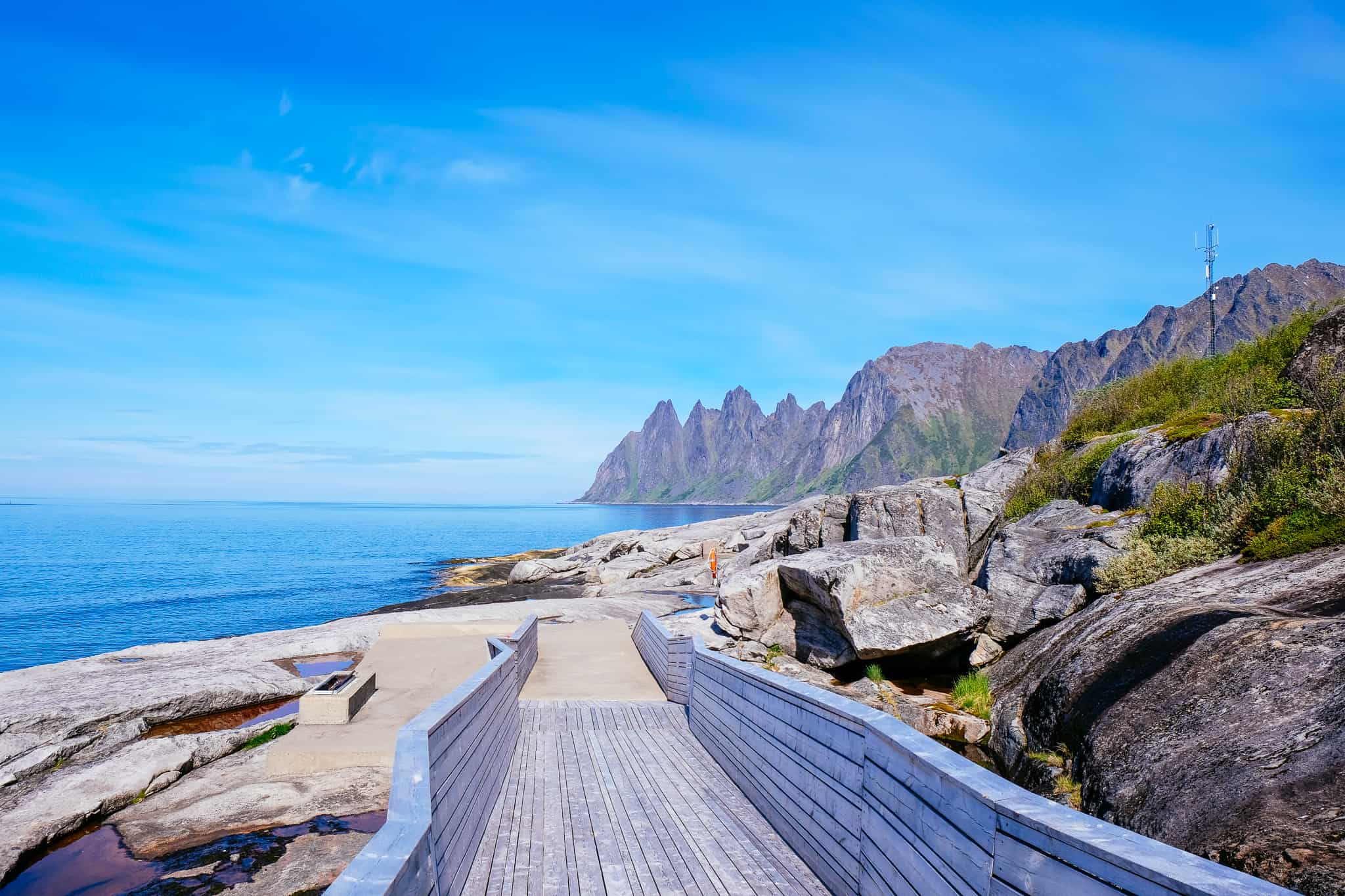 Tungeneset is one of the most scenic stops on the Senja Tourist Road. There is a walkway that takes you along the shoreline towards a view of the mountain Oksen (with the sharp peaks), also known as ‘The Devil’s Jaw’, as well as a lovely view out to the North Sea.