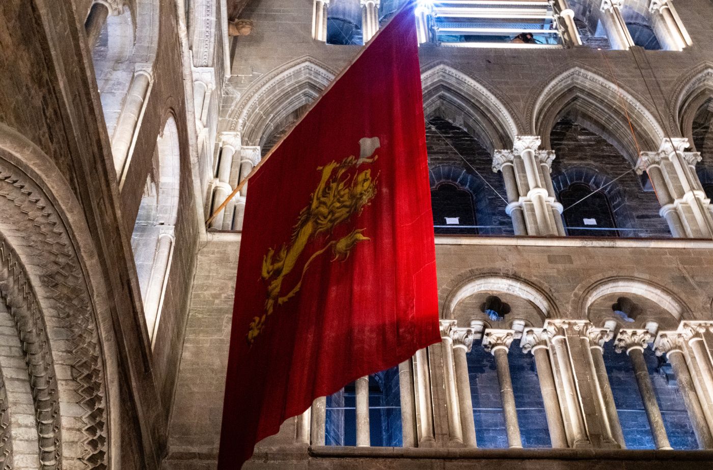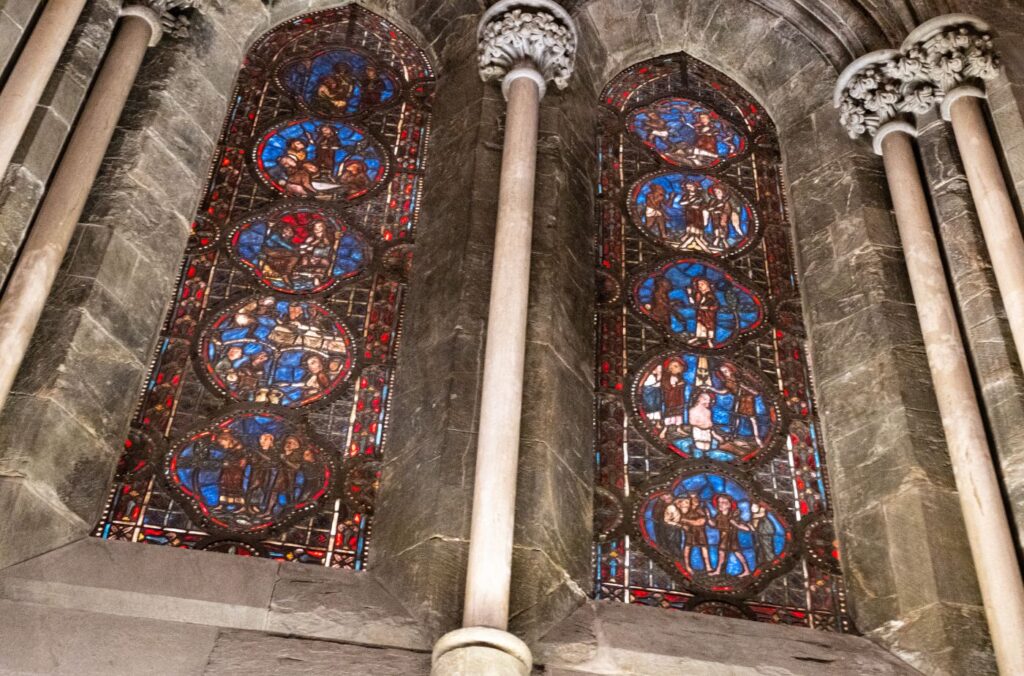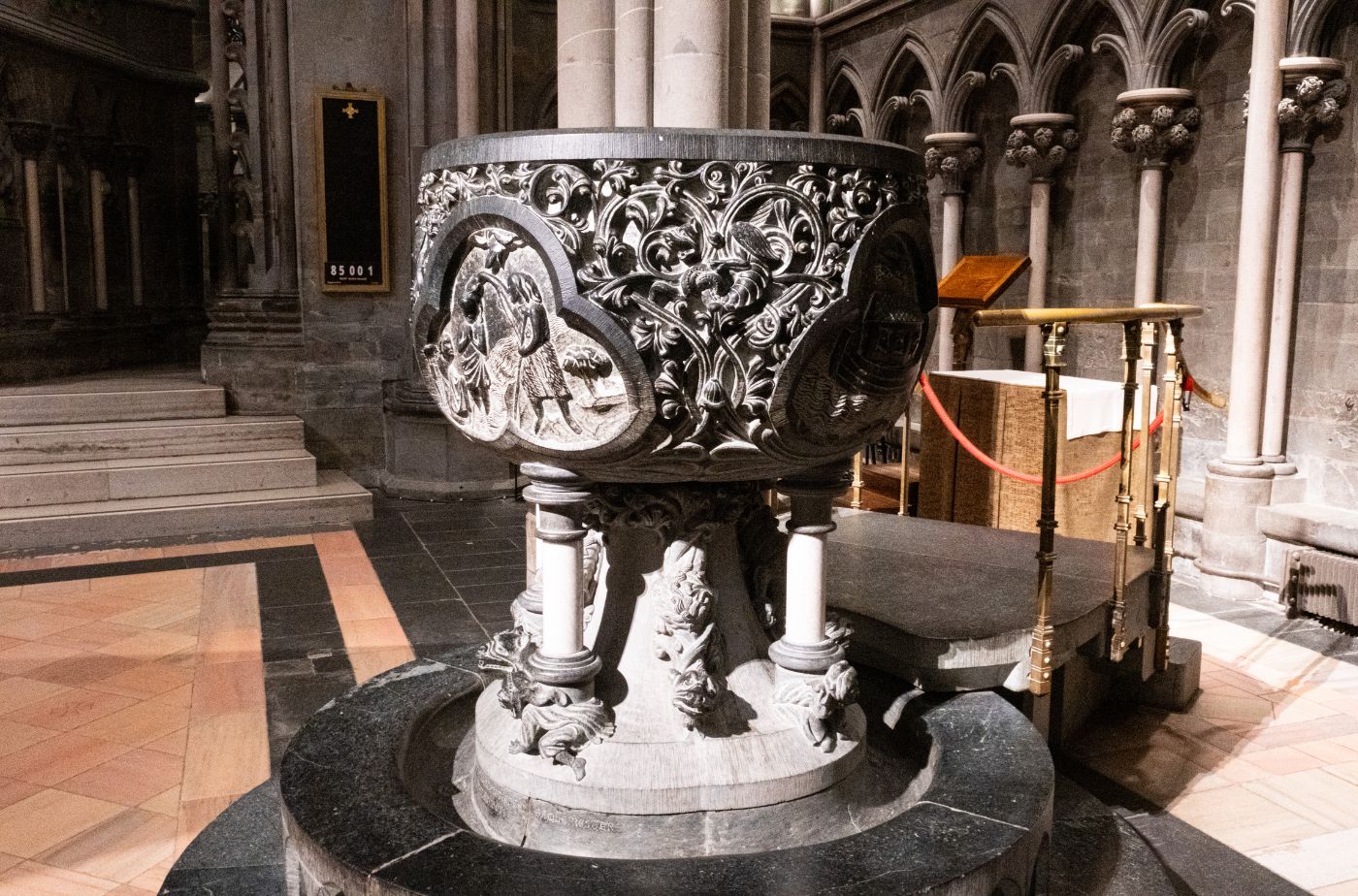There were no windows remaining when the restoration work began in the 19th century. They are made by Gabriel Kielland and date back to the early 20th century. The windows are inspired by French cathedrals, especially Chartres Cathedral. You’ll notice they are quite dark; this is because Kielland travelled through France and assumed the windows in France were purposely dark. However, the French had not cleaned the windows! That’s why the windows in the cathedral are so dark.