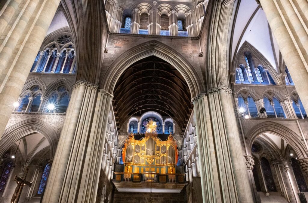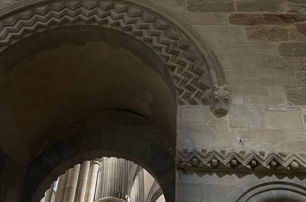 The northern portal is in the Anglo Norman style, the version of Romanesque architecture that was developed in Normandy and England in the 11th century. The portal has zigzag borders, folding capitals, and lion masks. It’s one of the best places in the cathedral to see the Romanesque architecture.