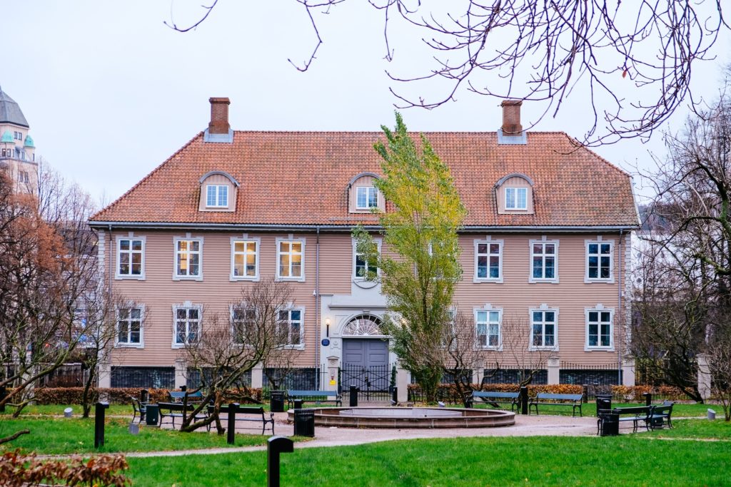 The dark brown building that you’ll follow along Revierstredet and then later onto Kongens gate is the oldest building you’ll see on this street. It was built in 1638 for a town bailiff and eventually became an orphanage. While it was an orphanage, 50 kids would be here. The women had to do yarn spinning, while the boys did carpentry. On the side, you can see the initials MHS and UMB, who were for the original owner’s Mads Haraldssøn and Annichen Mecklenburg. Parts of the property are among the first to be built in Christiania when the city was founded. The stone tablets in the wing towards Nedre Slottsgate indicate the building is from 1638, and according to the city antiquary in Oslo, this is Oslo’s oldest known building. There are traces of an even older building on the plot. The date 1640 on it is likely from an extension.
