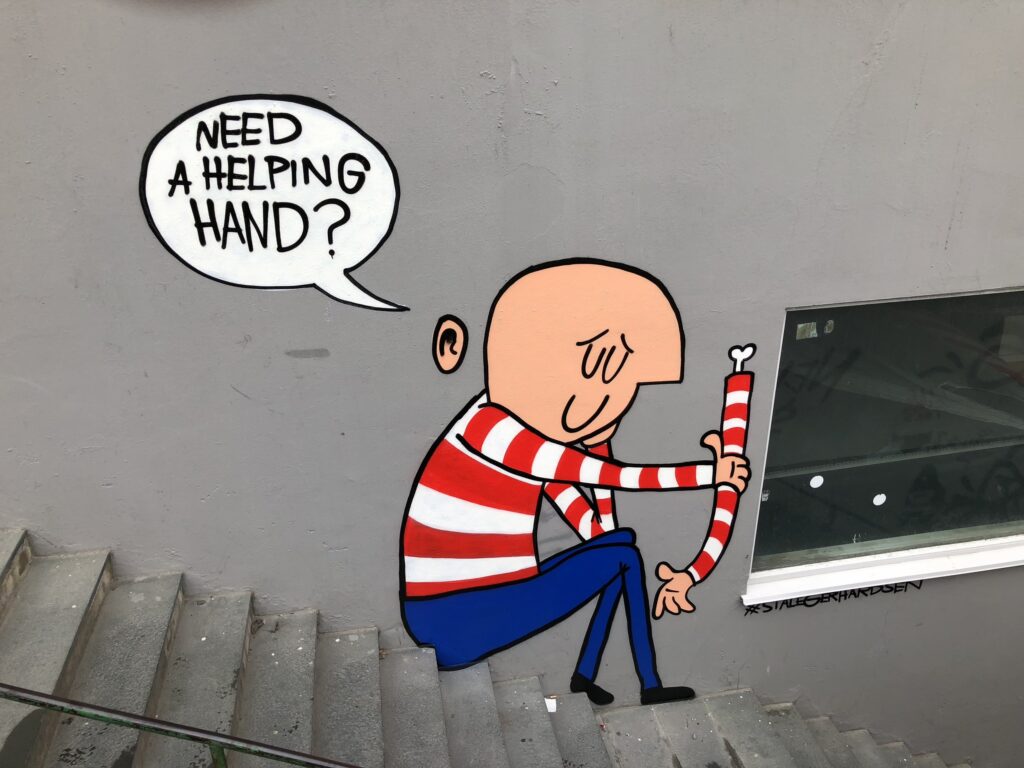 This is one of the newer pieces in town. The festival “Arts of Democracy” was held in September 2024, and an anonymous art collective from Bergen was hired to put up pieces around the city.