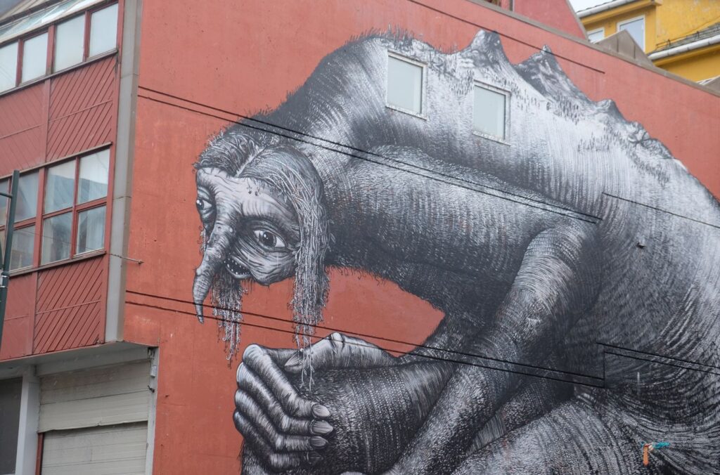 A Kiss Between Cultures is by the artist Animalito (Instagram). This one was always my favourite to show, so it’s a shame it’s now covered up by apartments. It depicted a Norwegian Sami and an Argentine child from the Andes, both dressed in their traditional attire, playing with a deer and a llama.