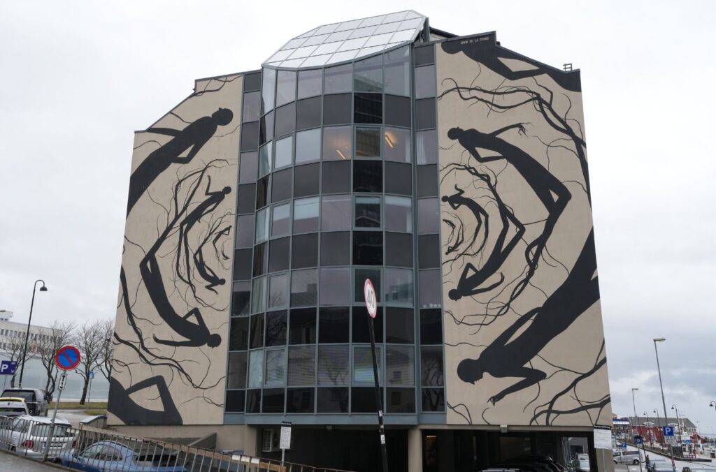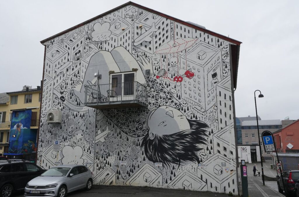 Insomnia is by the Italian artist Millo (Instagram). It reflects Bodø’s 24-hour summer light. Painted under the midnight sun, this vast mural shows everyday figures and buildings in crisp black-and-white lines, with only occasional touches of colour. Millo often paints whimsical urban scenes; here, the effect is dreamy and surreal.