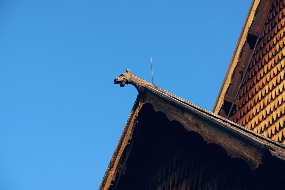 Heddal Stave Church has three towers. It has roof surfaces at many angles, and a walkway around the church. Legend has it that the undercover exterior area is where the Vikings kept their shields and swords to protect them from the rain. Is it true? Who knows! But I’ve heard it a few times at stave churches.