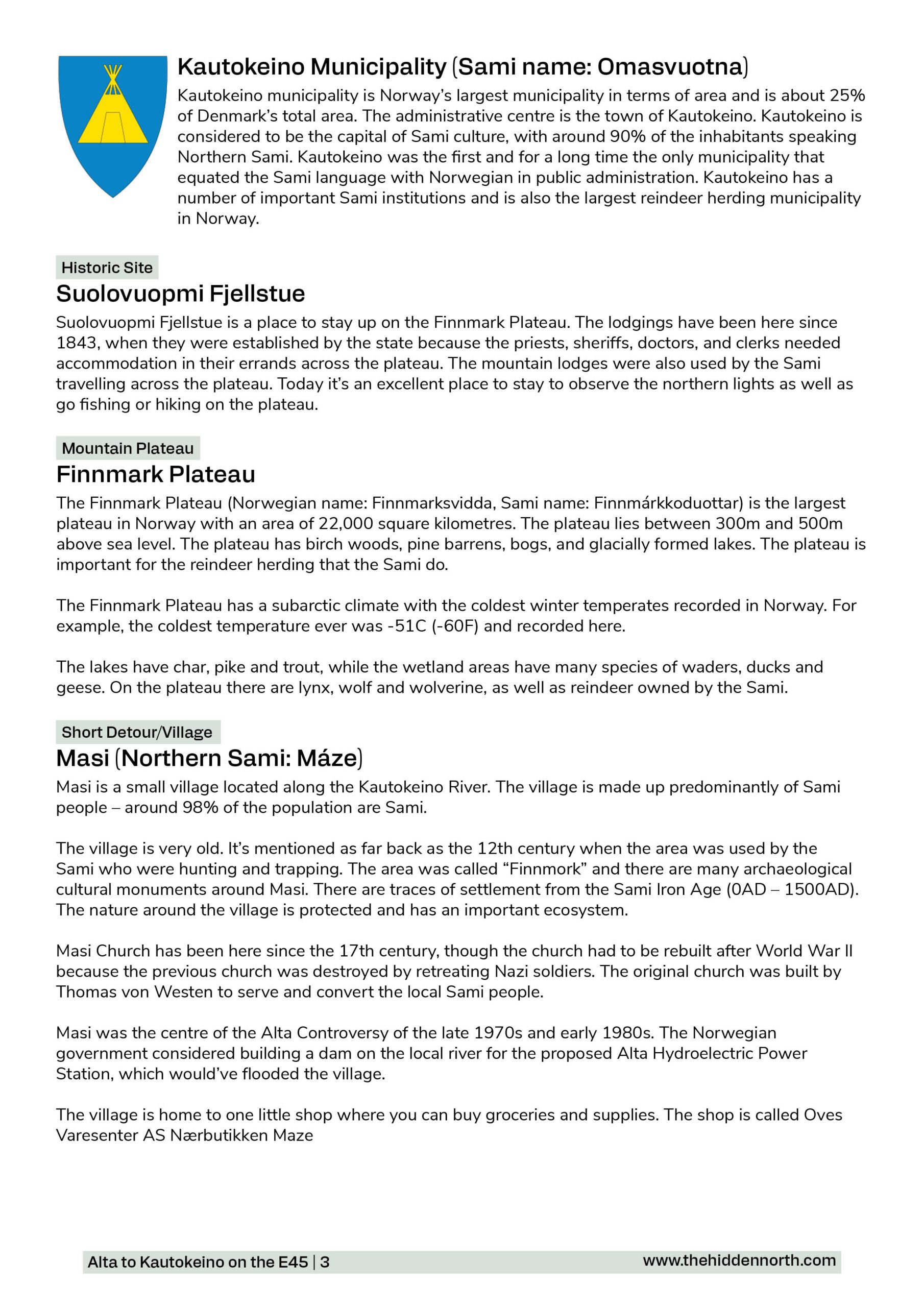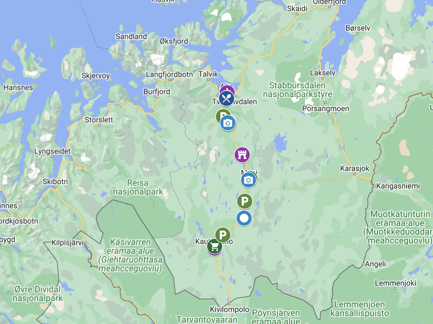 This short but scenic drive takes you from the large city of Alta on the Altafjord up to the top of the Finnmarksvidda Plateau. Along the way, you drive alongside the Alta Canyon – a spectacular and completely unique canyon that is perfect for hiking. Travel in the region of the Sami people and be sure to learn a little about their culture!