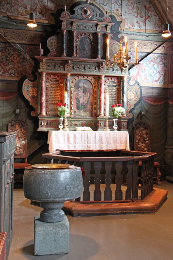 The church has staves, but they are only in the corners. Most stave churches have a raised central space, making the staves much more visible. The baptismal font is soapstone and dates back to around the time the church was built, as is the crucifix. The altarpiece is from Lutheran times, around 1629.