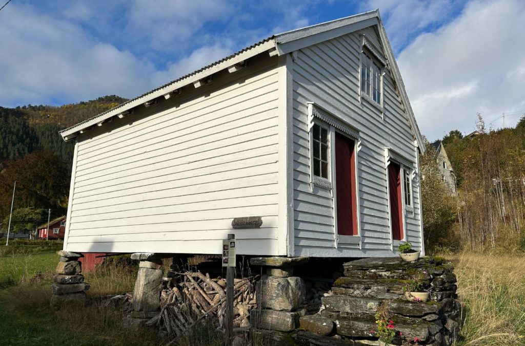 This belonged to the original farm property at Urke and was used for storing food. It was common for the servants to have bedrooms here as well. You’ll notice the building has been raised on stones – this is to stop animals from getting inside and eating all the food; the stairs were often separated from the doorstep by an opening of 30cm. It also kept the food nice and dry in case of rain and flooding. You will see nine storehouses around Urke.